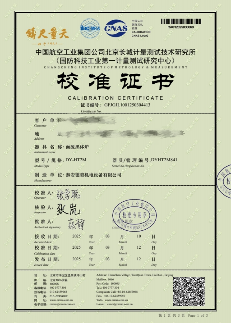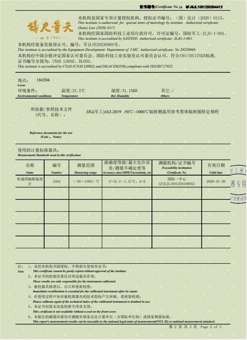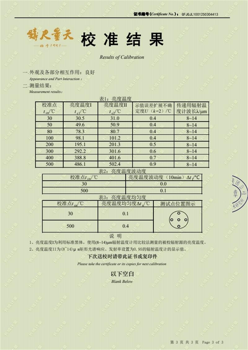面源黑體爐(室溫+5-500℃)校準證書 2025-3-15 本文被閱讀 5654 次