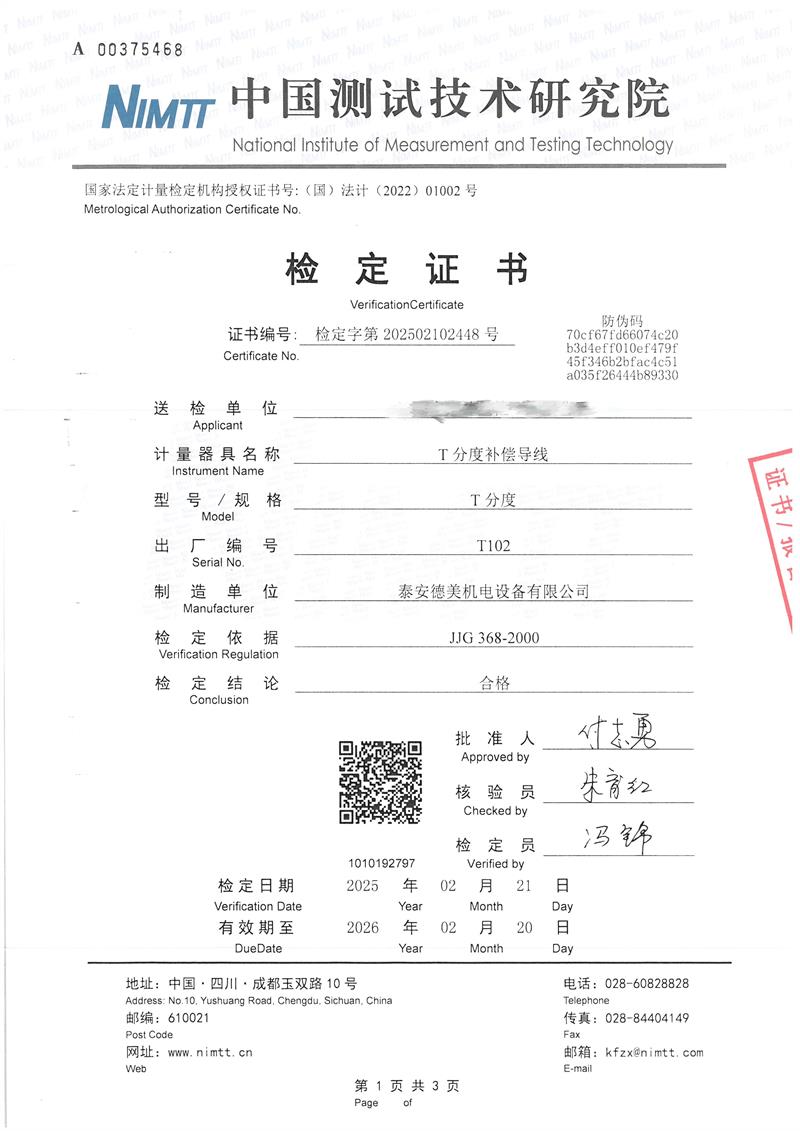 T分度補償導(dǎo)線檢定證書 2025-2-25 本文被閱讀 4999 次