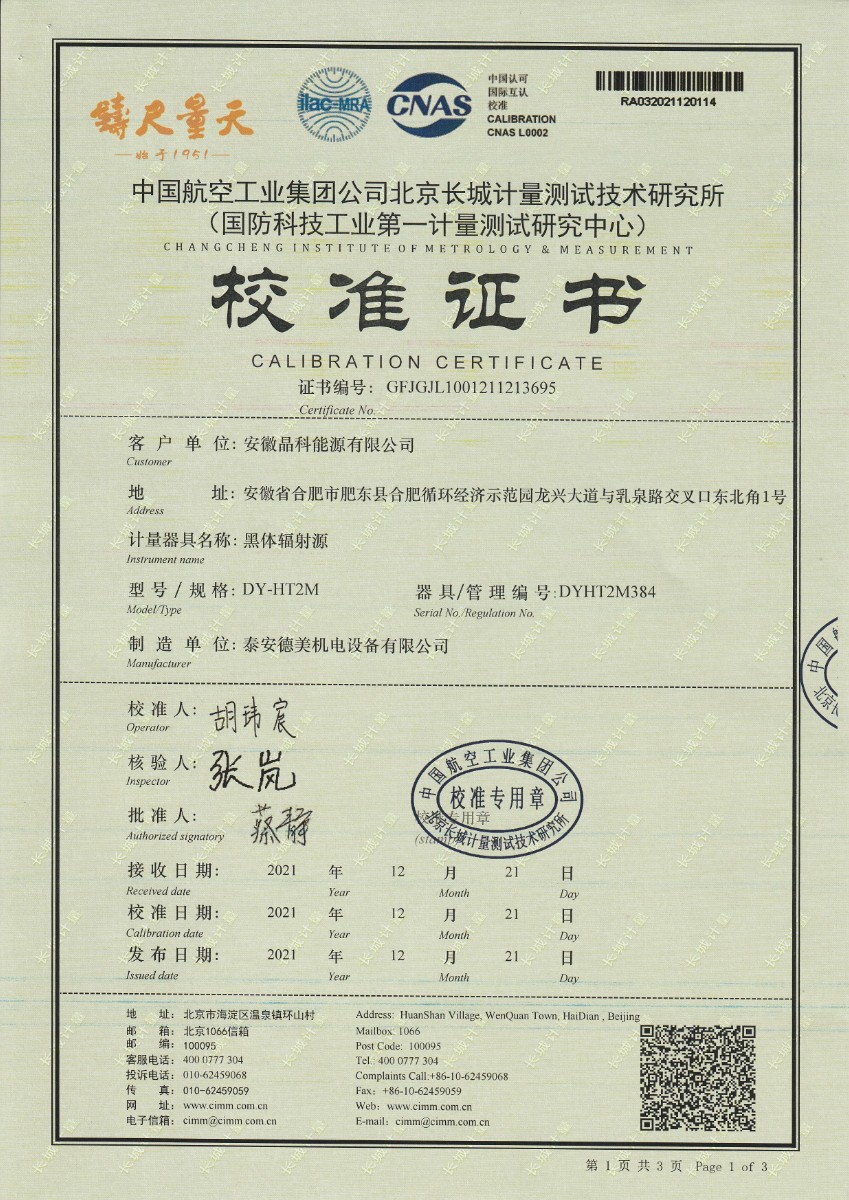 安徽晶科能源有限公司-黑體輻射源 2022-1-4 本文被閱讀 15560 次
