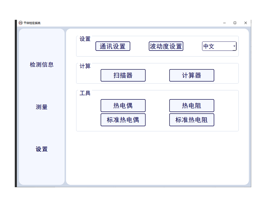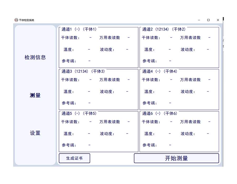 測量狀態(tài)可進(jìn)行多通道狀態(tài)干體爐,萬用表讀數(shù)。當(dāng)前標(biāo)準(zhǔn)器溫度,溫度波動性等數(shù)據(jù)的讀取,并一鍵生成證書??蓪?shí)現(xiàn)一鍵中英文切換。