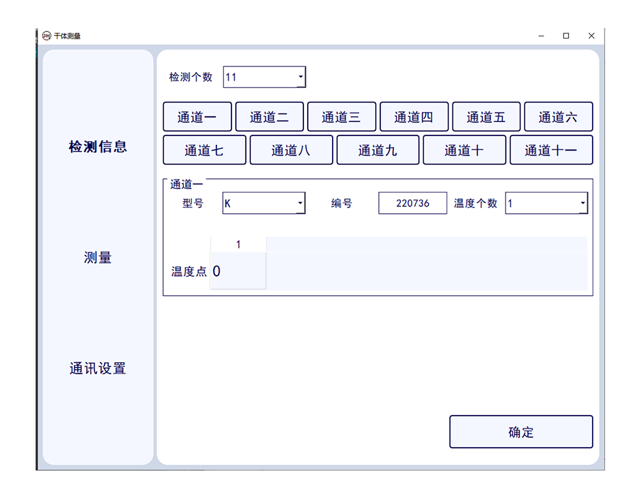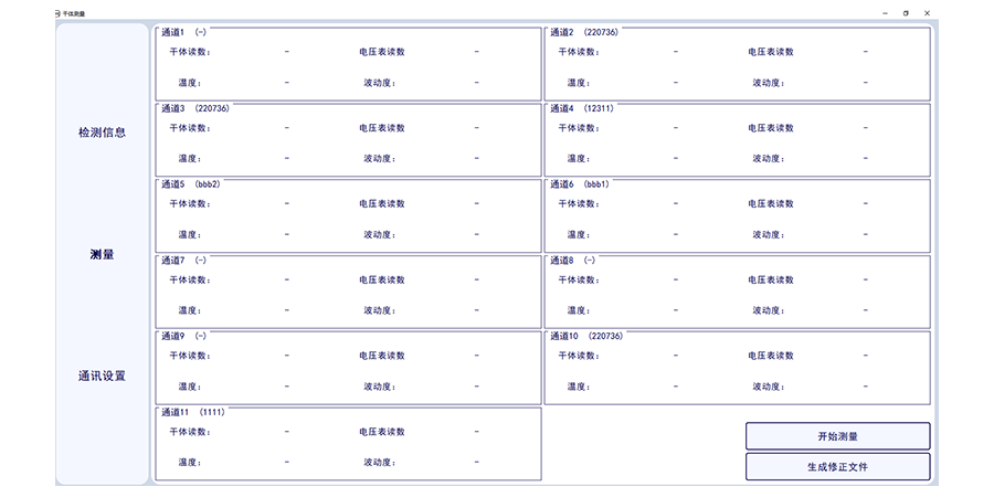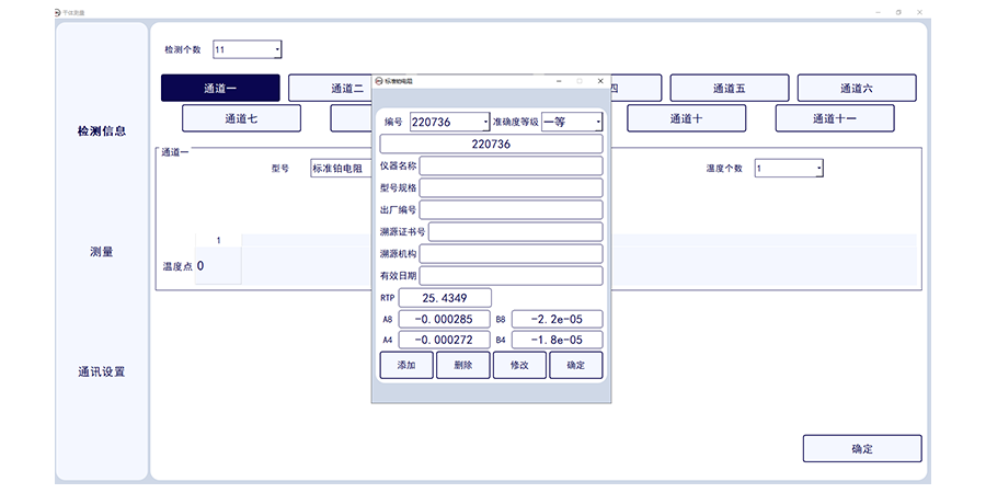此套軟件可讀取1-11路標(biāo)準(zhǔn)通道的數(shù)字萬用表的電壓數(shù)值,標(biāo)準(zhǔn)溫度值,并一鍵轉(zhuǎn)換溫度值,并實現(xiàn)溫度波動度計算,可確定干體溫度校驗爐與標(biāo)準(zhǔn)器溫度的差值。可一鍵生成證書數(shù)據(jù)。