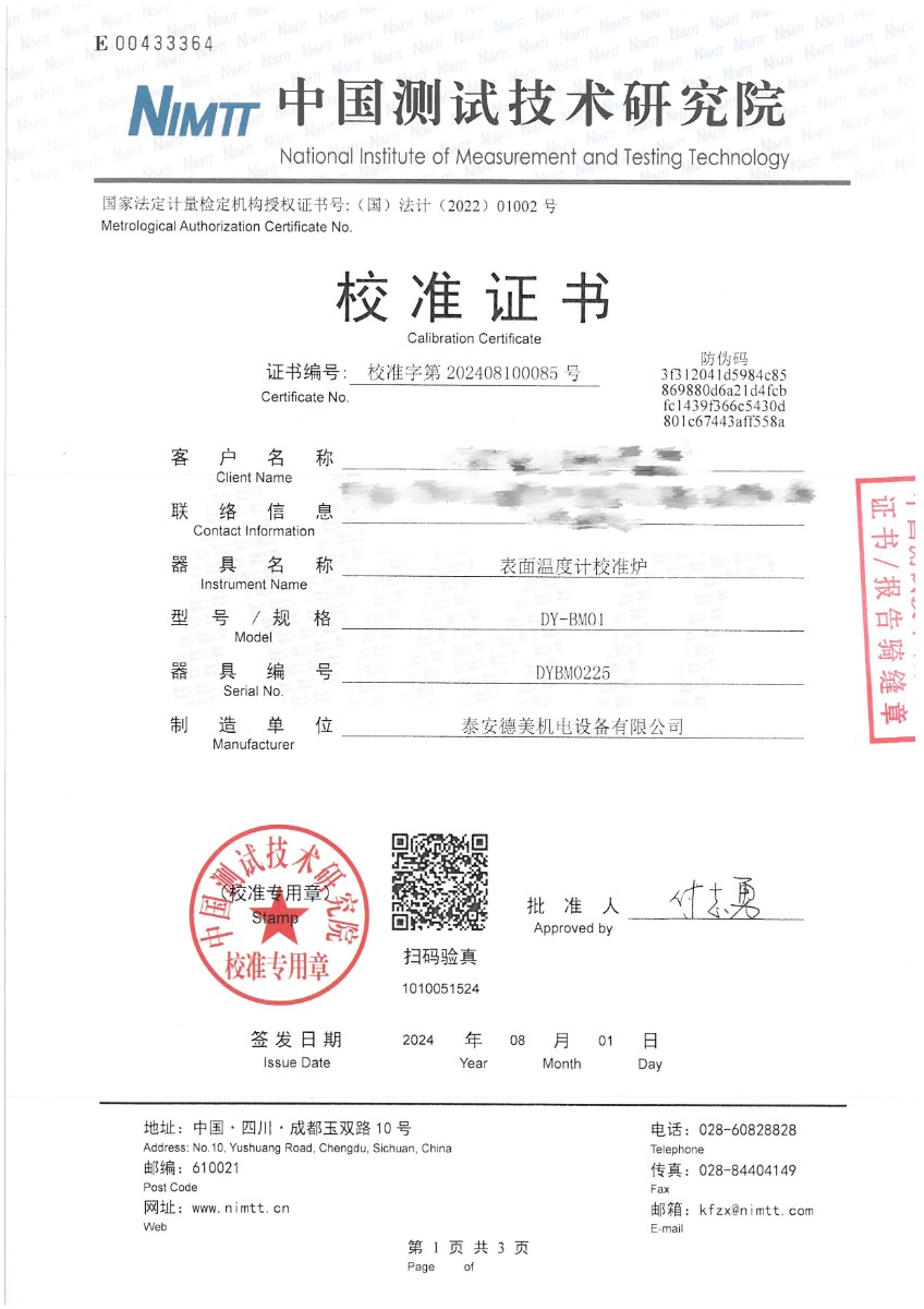 表面溫度計(室溫+5~400℃)校準證書 2024-8-12 本文被閱讀 7394 次