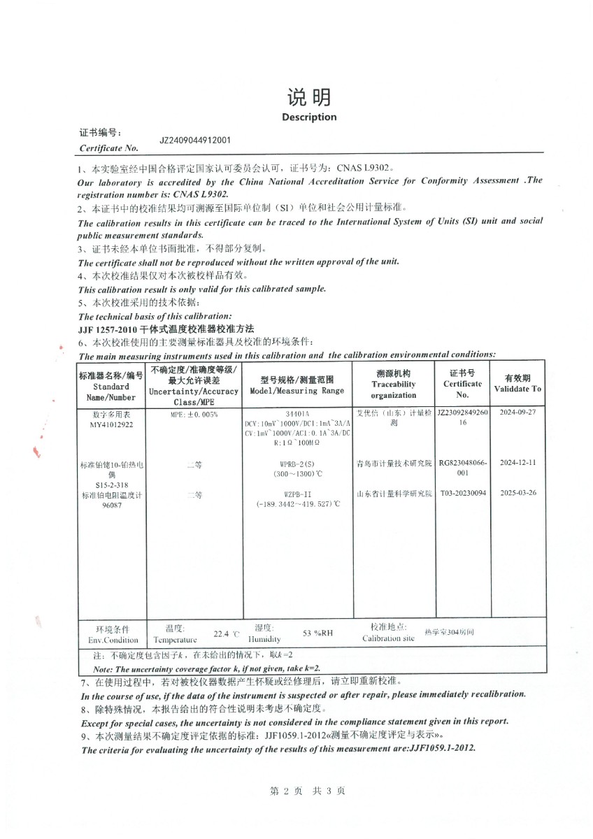 中溫干體(50~450℃)校準證書 2024-9-18 本文被閱讀 6859 次