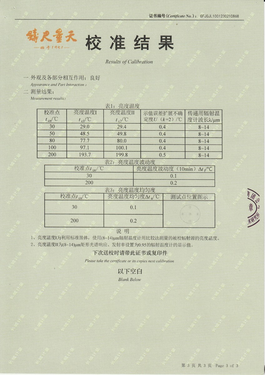 | 上一條:西安和其光電科技股份有限公司 低溫浴式黑體輻射源 校準證書 | 下一條:高精度制冷恒溫槽(-80~100℃)校準證書 |