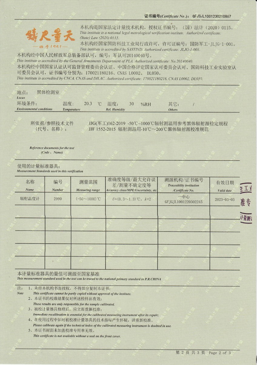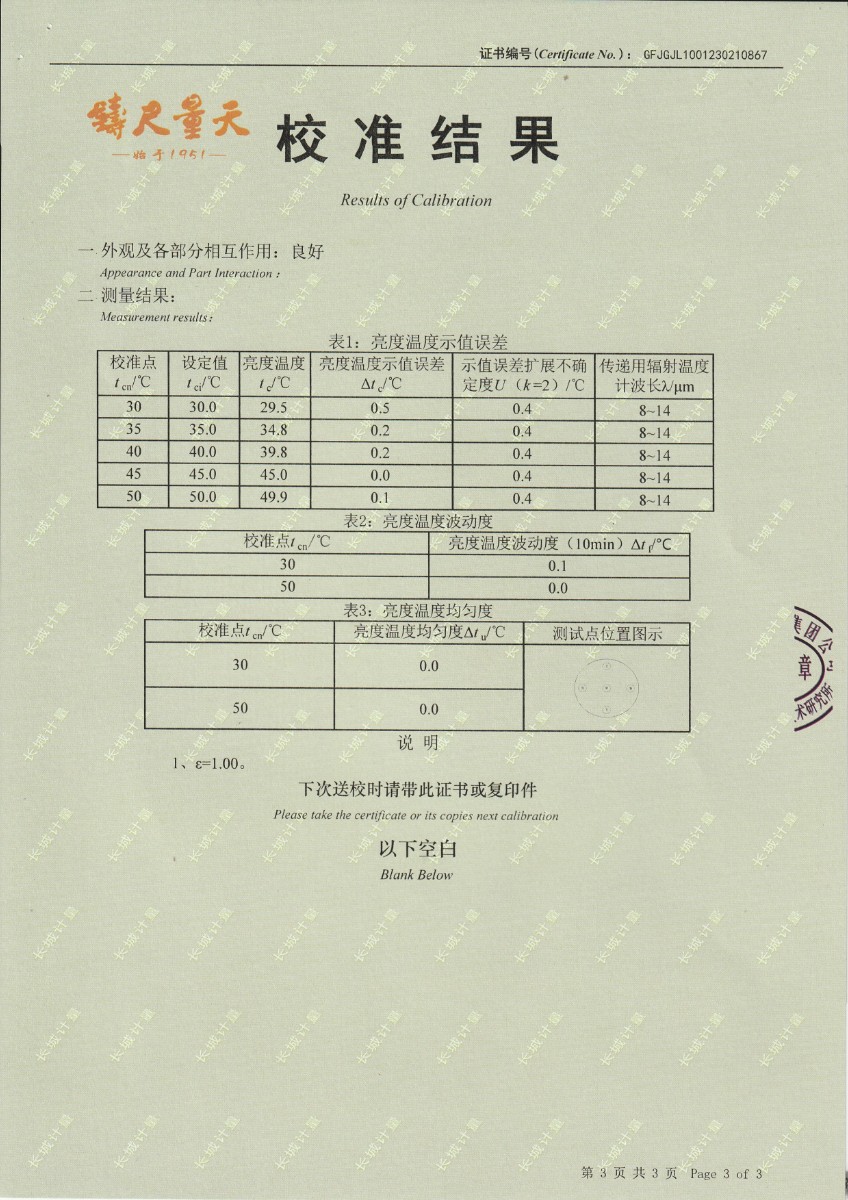 | 上一條:江蘇省產(chǎn)品質(zhì)量監(jiān)督檢驗研究院 黑體輻射源 校準證書 | 下一條:高精度制冷恒溫槽(-80~100℃)校準證書 |