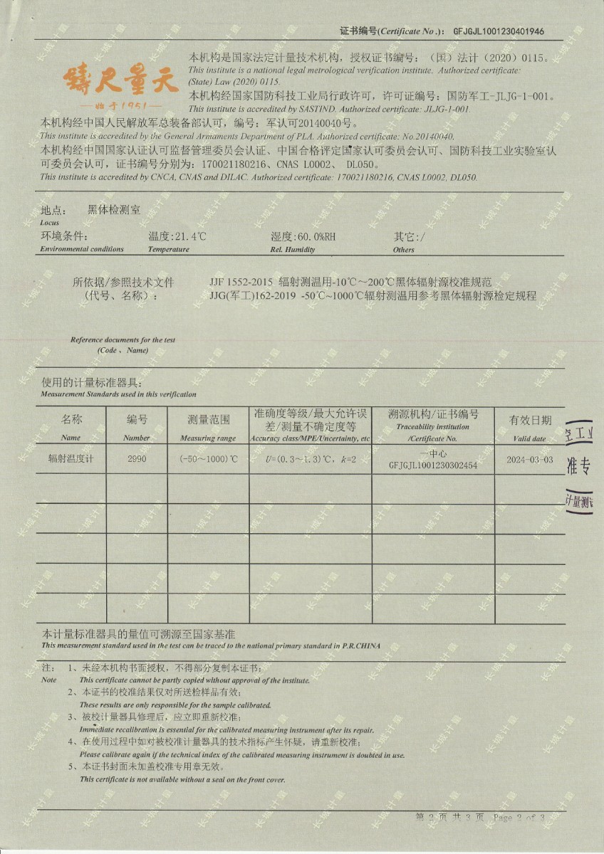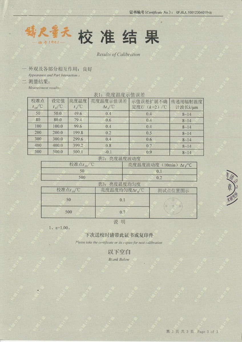 浙江弘志計量測試有限公司 黑體輻射源 校準證書 2023-5-4 本文被閱讀 13494 次