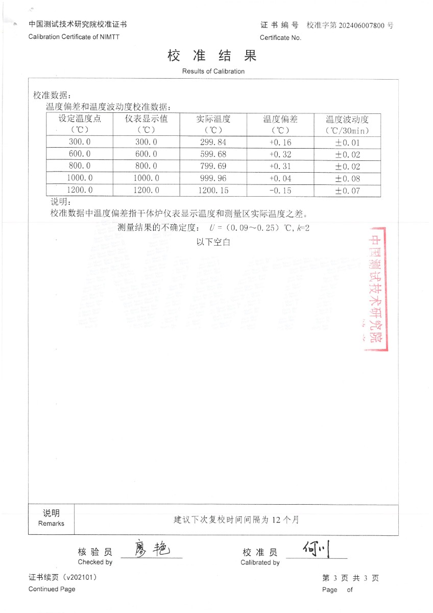 高溫干體爐(300~1200℃)校準證書 2024-7-1 本文被閱讀 6541 次