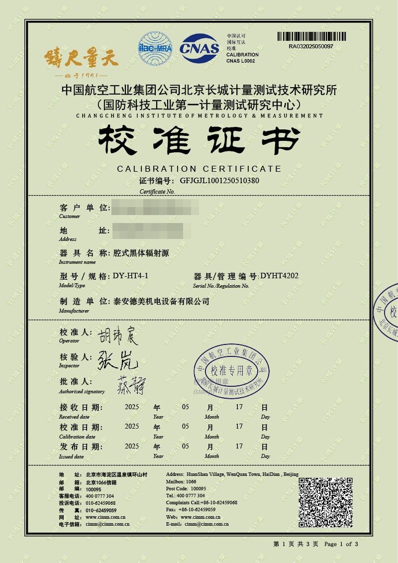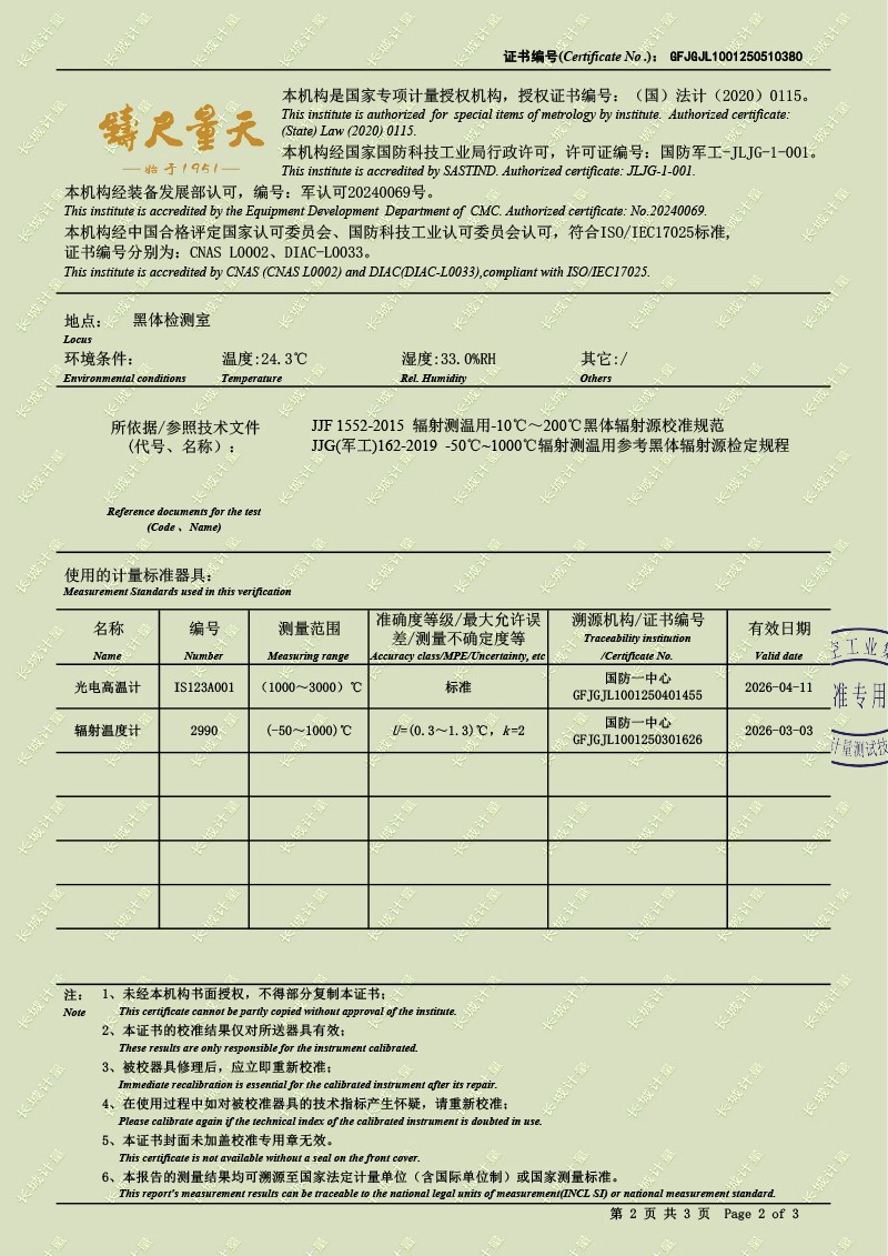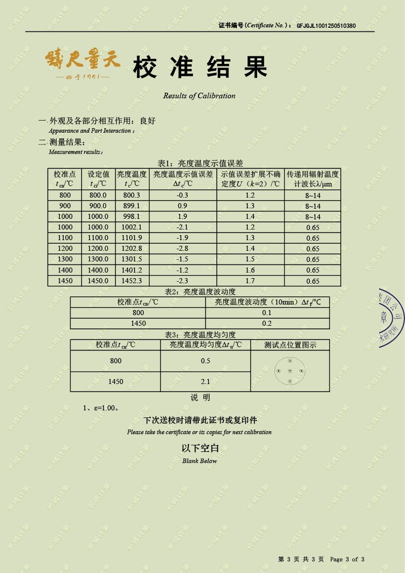 腔式黑體輻射源(800-1450℃)校準證書 2025-5-28 本文被閱讀 3678 次