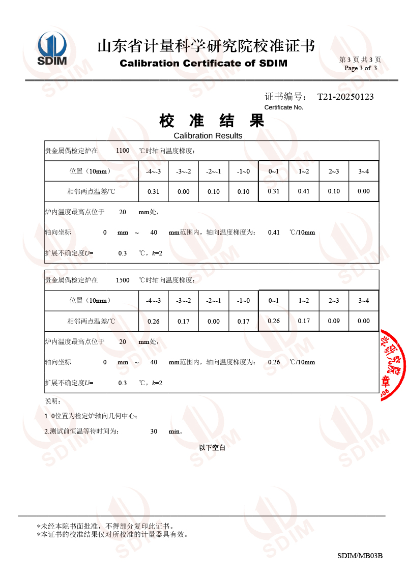高溫貴金屬熱電偶檢定爐(800-1600℃)校準證書