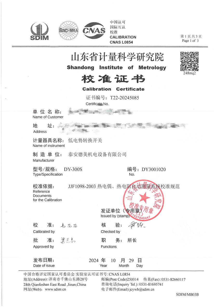 | 上一條:標(biāo)準(zhǔn)濕度發(fā)生器校準(zhǔn)證書 | 下一條:高精度制冷恒溫槽(-80~100℃)校準(zhǔn)證書 |