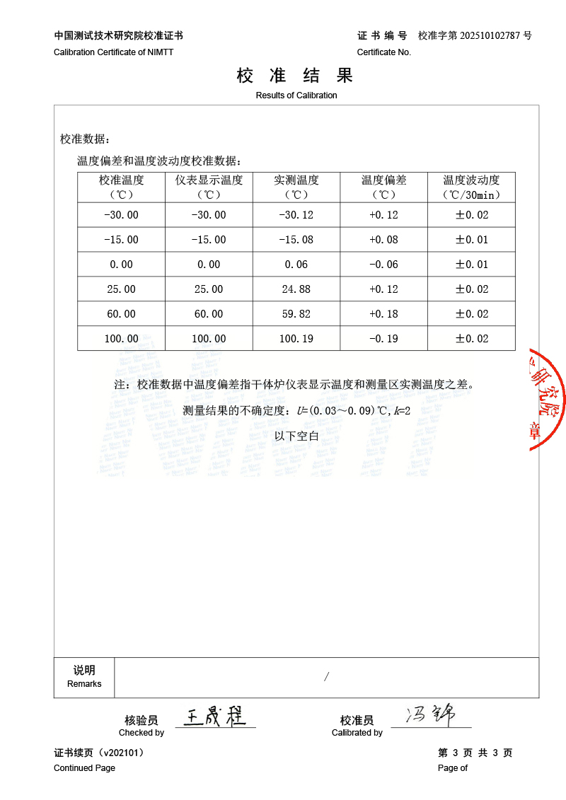 | 上一條:超低溫面源黑體爐(-40-80℃)校準(zhǔn)證書 | 下一條:高精度制冷恒溫槽(-80~100℃)校準(zhǔn)證書 |