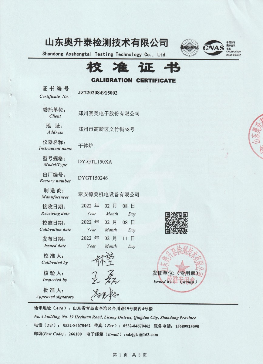 | 上一條:鄭州賽奧電子股份有限公司-干體爐DYGT150245 | 下一條:露點(diǎn)儀校準(zhǔn)系統(tǒng)校準(zhǔn)證書 |