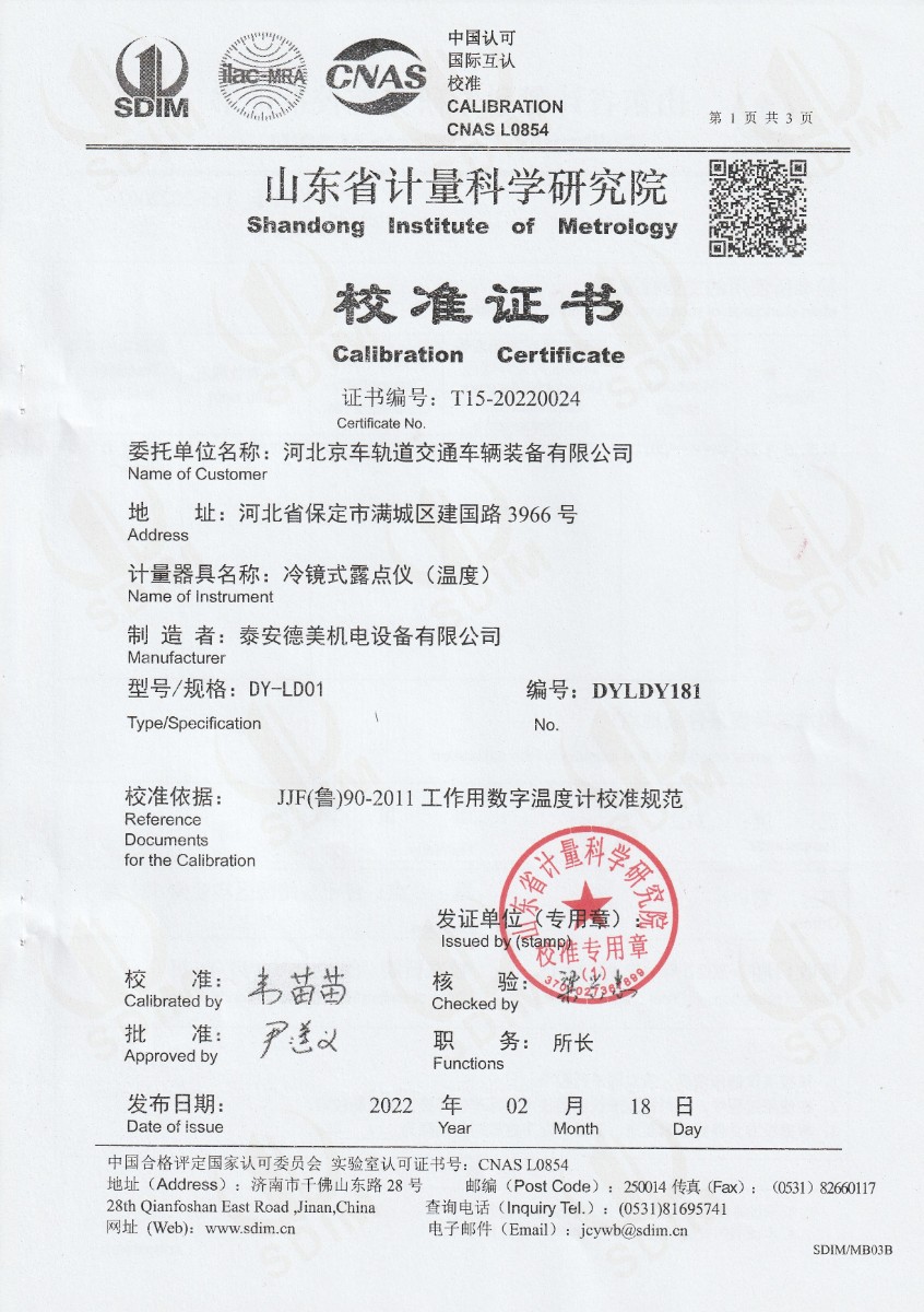 | 上一條:鄭州賽奧電子股份有限公司-干體爐DYGT150246 | 下一條:露點儀校準系統(tǒng)校準證書 |
