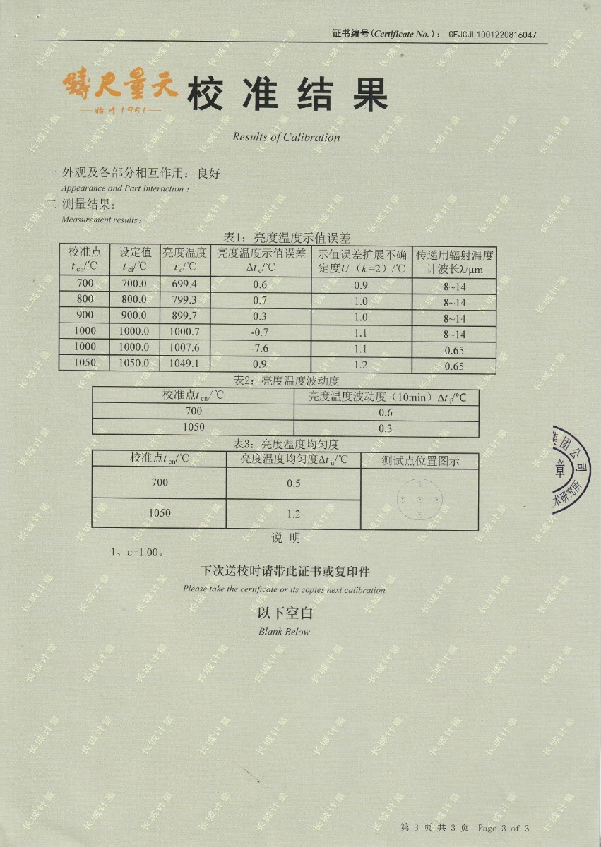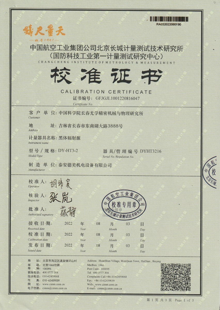 | 上一條:中國科學(xué)院長春光學(xué)精密機(jī)械與物理研究所-黑體爐DY-HT3-1 | 下一條:高精度制冷恒溫槽(-80~100℃)校準(zhǔn)證書 |