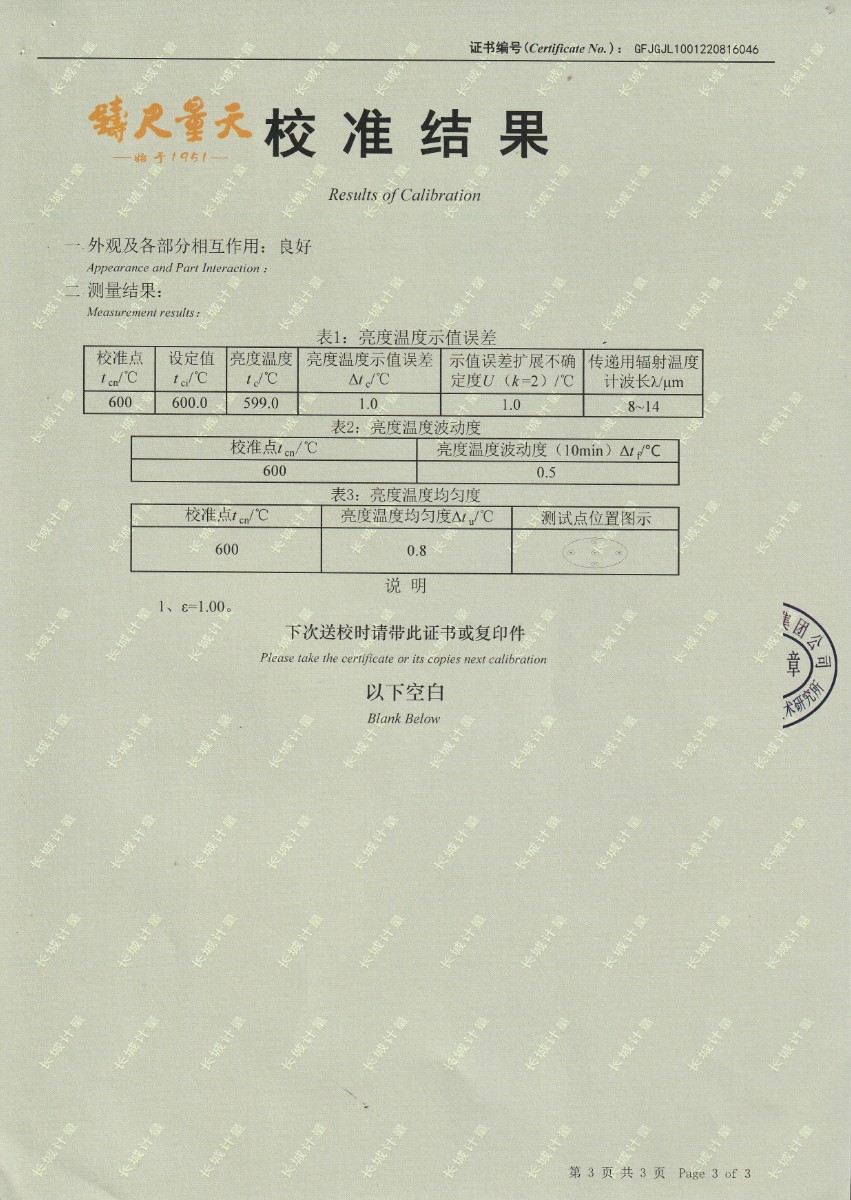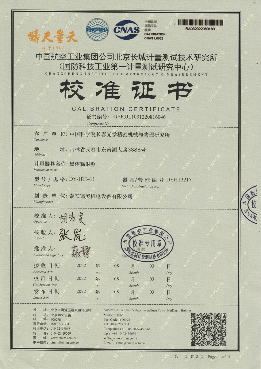 | 上一條:中國(guó)科學(xué)院長(zhǎng)春光學(xué)精密機(jī)械與物理研究所-黑體爐DY-HT3-2 | 下一條:高精度制冷恒溫槽(-80~100℃)校準(zhǔn)證書(shū) |