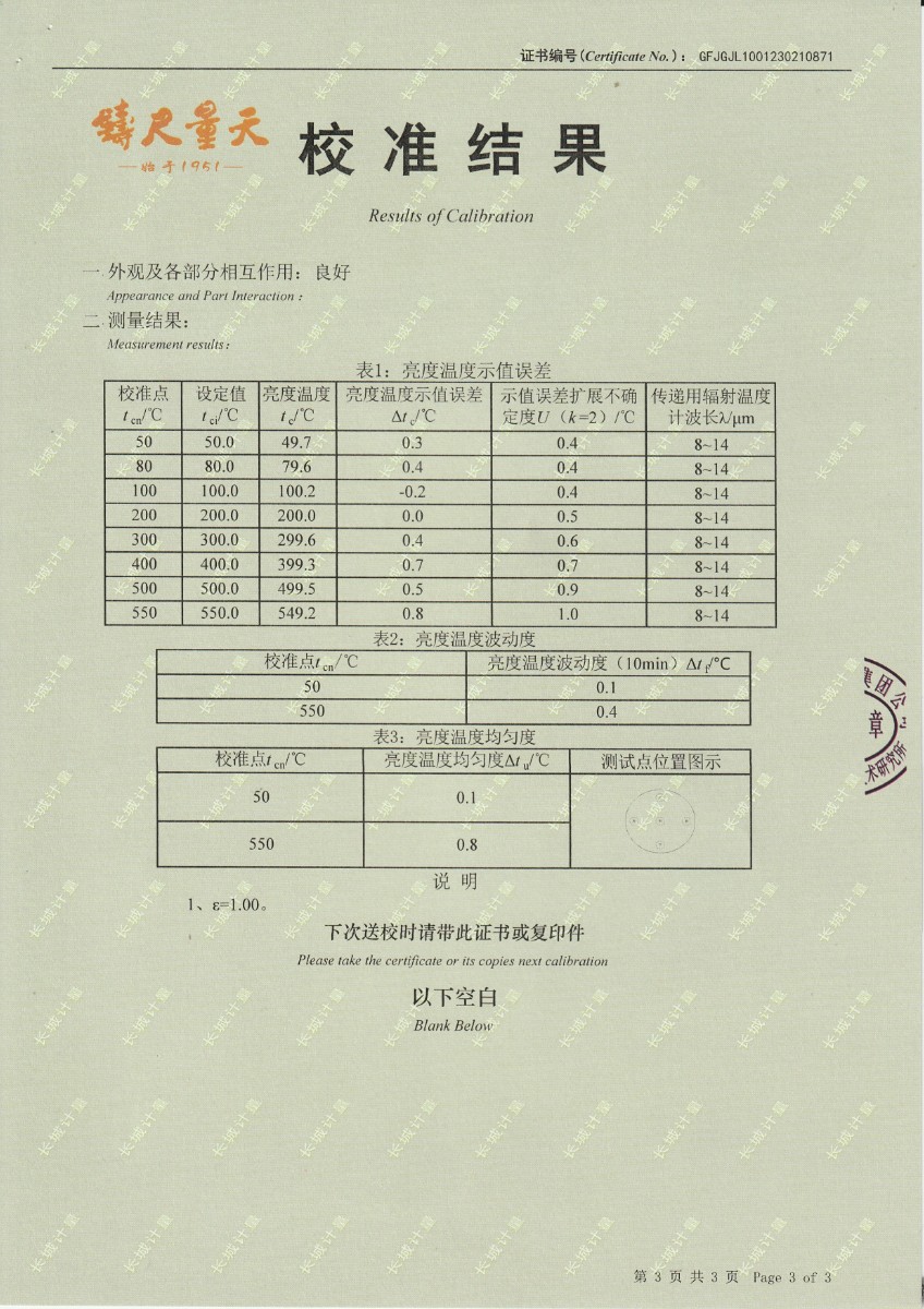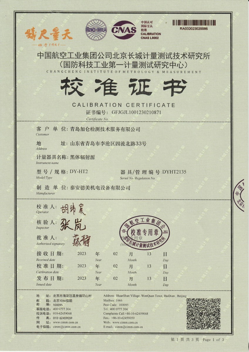 青島加侖檢測技術(shù)服務有限公司 黑體輻射源 校準證書 2023-2-25 本文被閱讀 13703 次