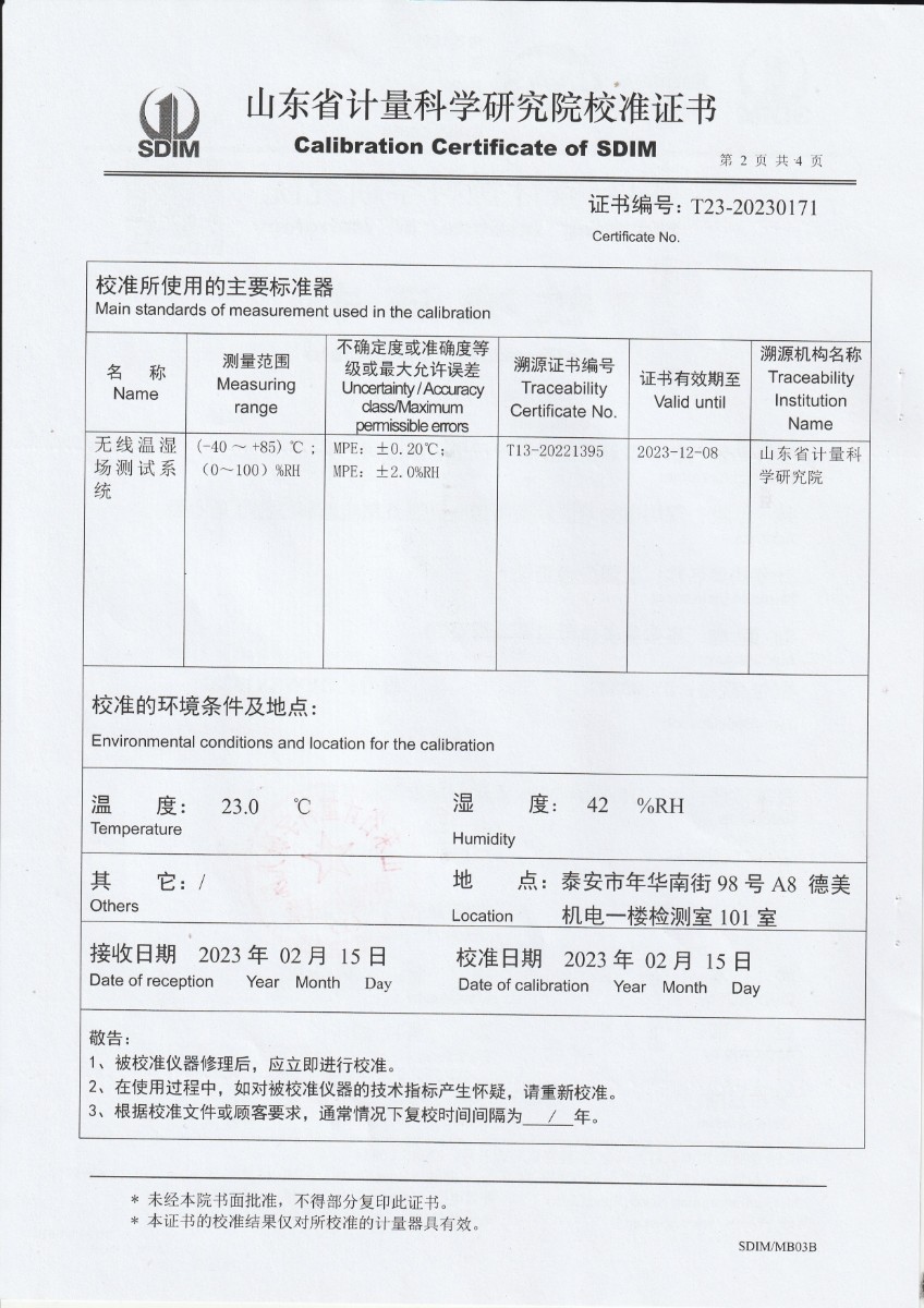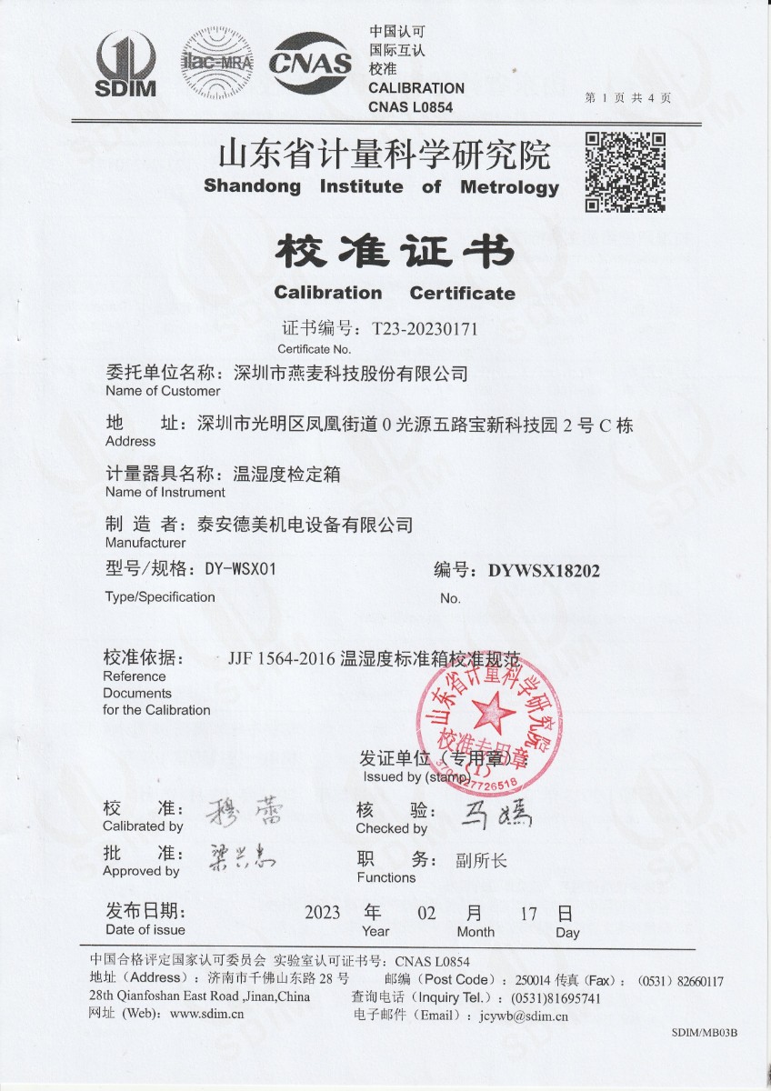 深圳市燕麥科技股份有限公司 溫濕度檢定箱 校準證書 2023-3-2 本文被閱讀 14426 次