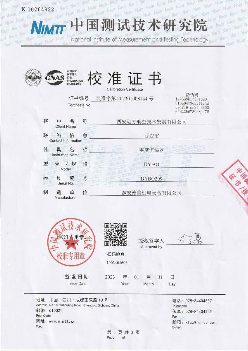 西安遠(yuǎn)方航空技術(shù)發(fā)展有限公司 零度恒溫器 校準(zhǔn)證書(shū) 2023-4-10 本文被閱讀 14666 次