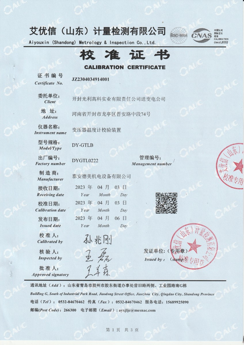 開封光利高科實業(yè)有限責任公司送變電公司 變壓器溫度計校驗裝置 校準證書(1) 2023-4-15 本文被閱讀 10706 次