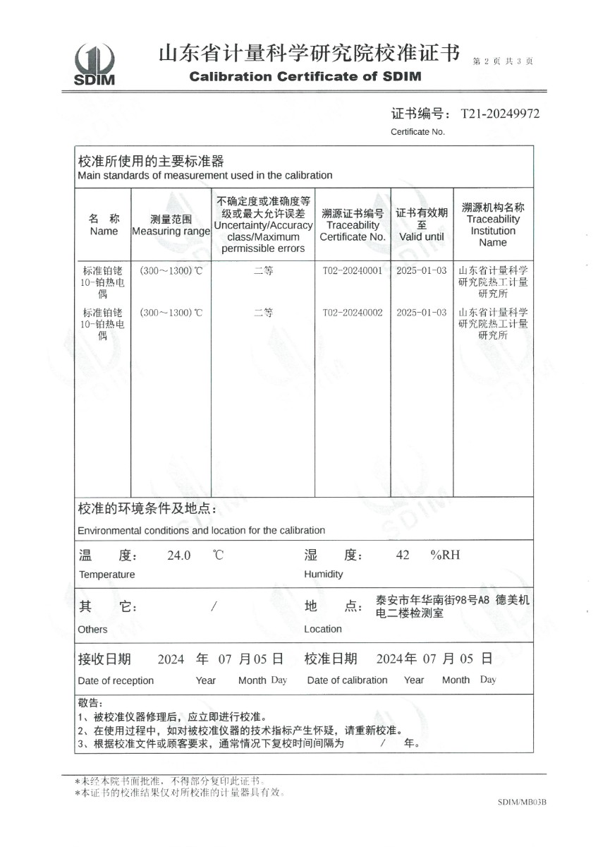 熱電偶檢定爐(300~1200℃)校準證書 2024-7-11 本文被閱讀 7276 次