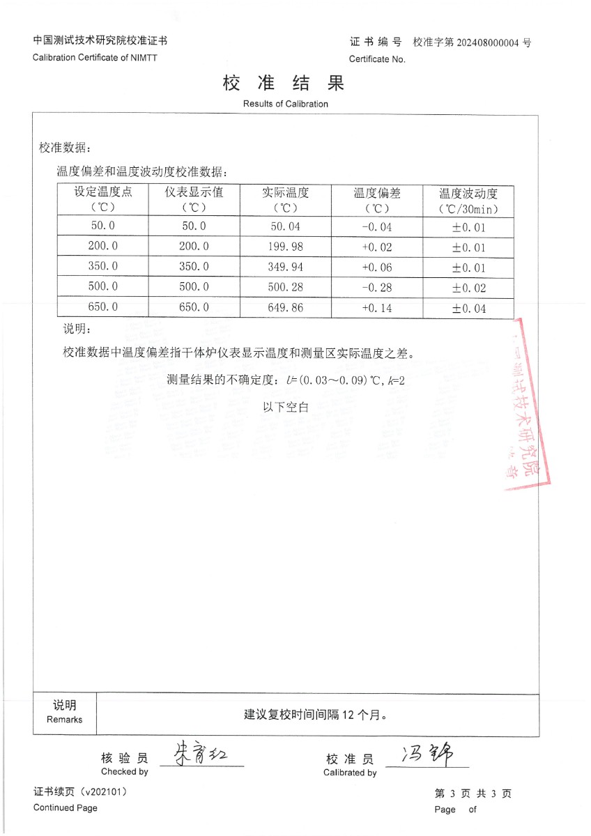 | 上一條:干體爐300(室溫+5℃~650℃)校準(zhǔn)證書 | 下一條:高精度制冷恒溫槽(-80~100℃)校準(zhǔn)證書 |