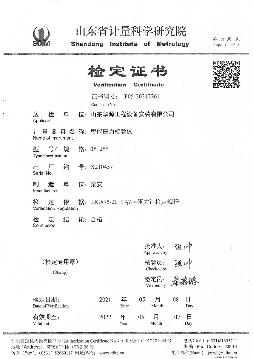 | 上一條:山東華源工程設(shè)備安裝有限公司-智能壓力校驗儀X210456 | 下一條:中溫面源黑體爐-校準(zhǔn)證書 |