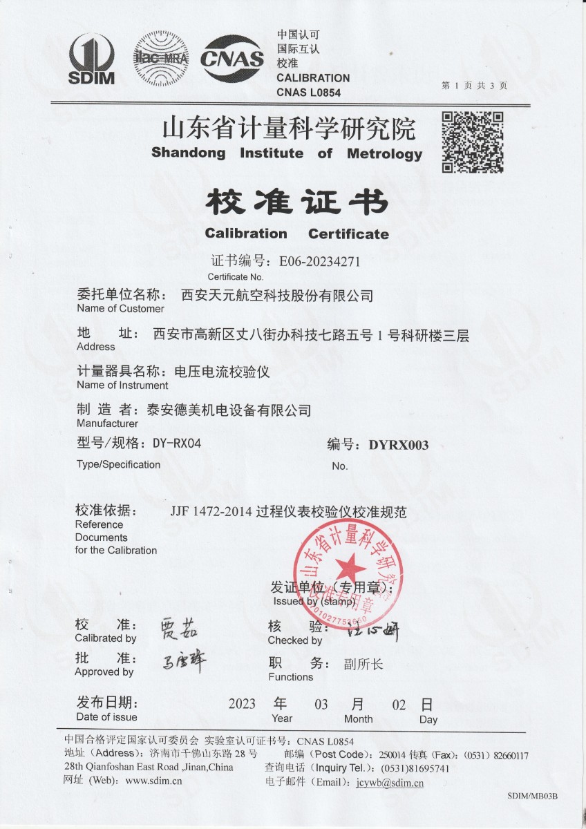 西安天元航空科技股份有限公司 電壓電流校驗(yàn)儀 校準(zhǔn)證書(shū) 2023-3-6 本文被閱讀 12578 次