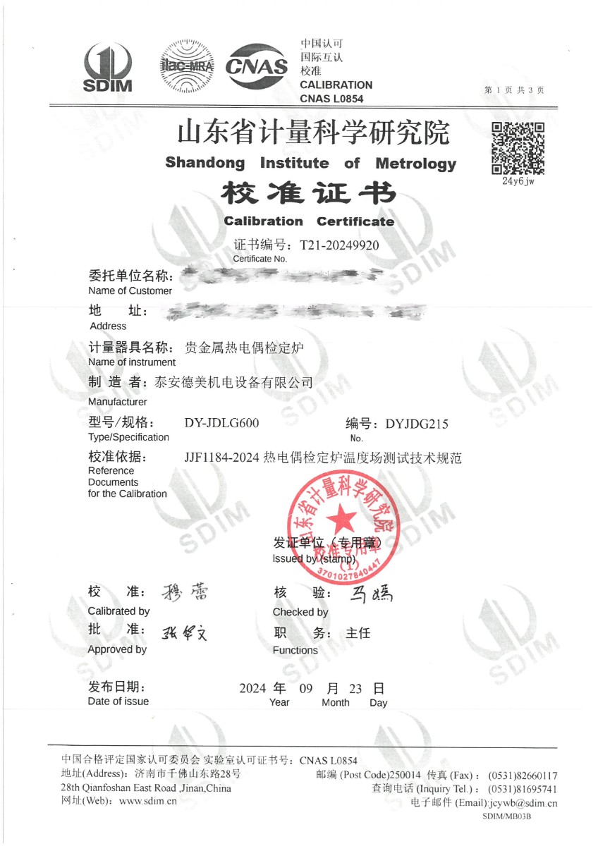 貴金屬熱電偶檢定爐(300~1000℃)校準(zhǔn)證書(shū)