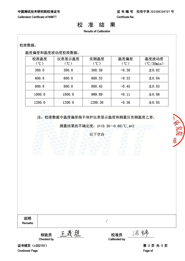 高溫干體爐(300-1200℃)校準證書 2025-9-22 本文被閱讀 2249 次