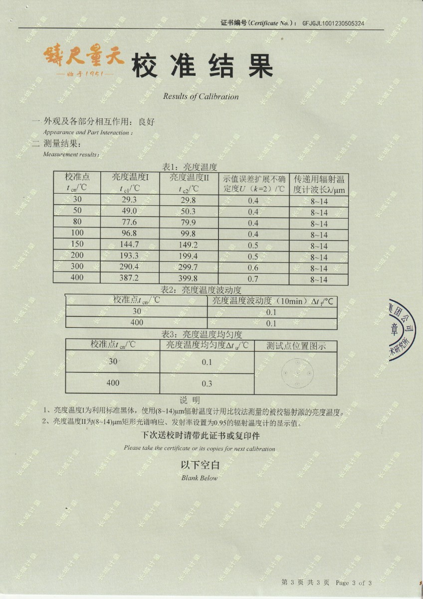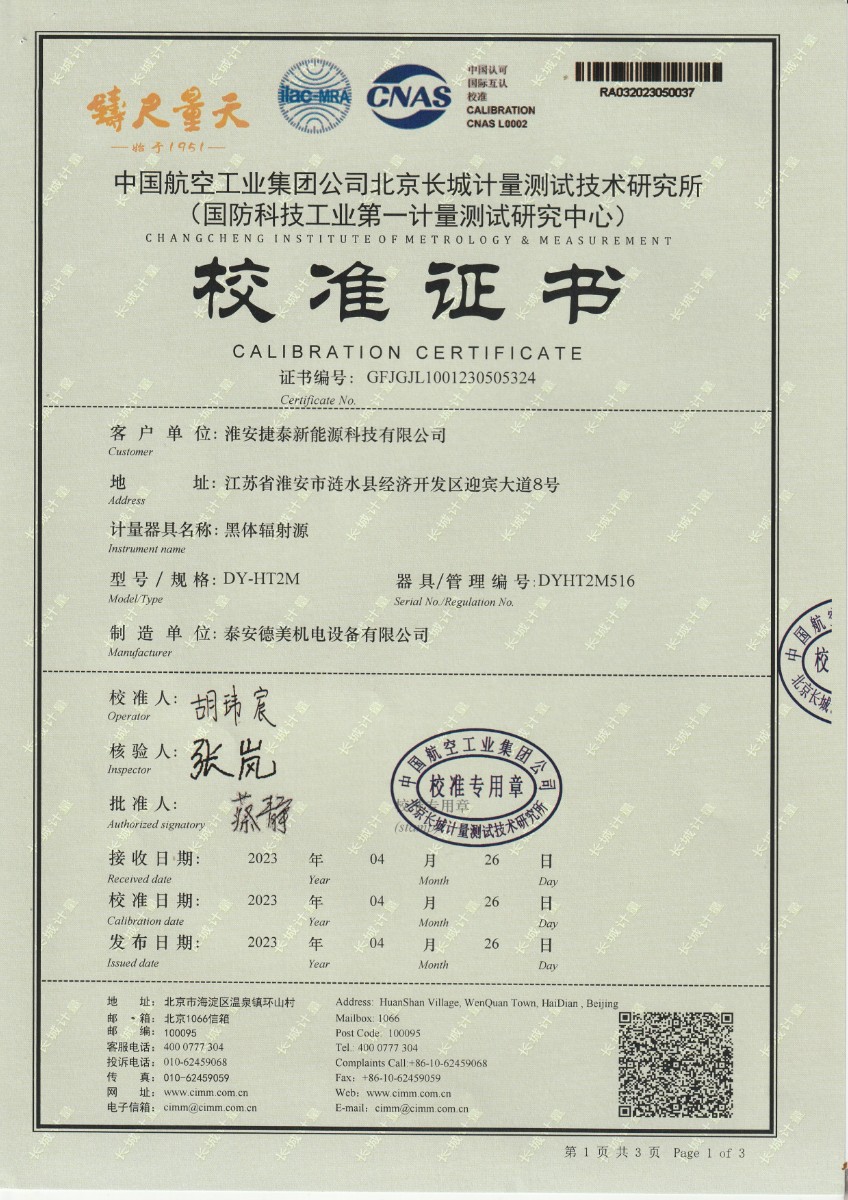 淮安捷泰新能源科技有限公司 黑體輻射源 校準(zhǔn)證書 2023-5-18 本文被閱讀 11300 次