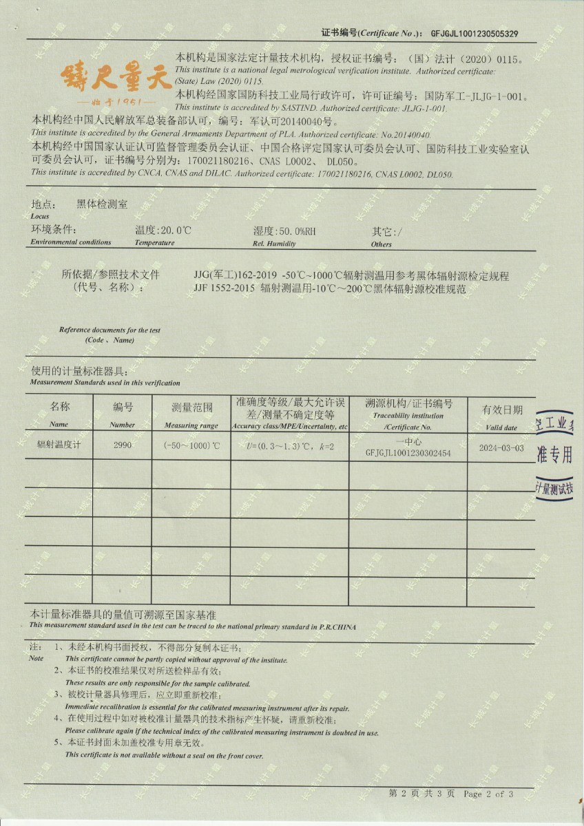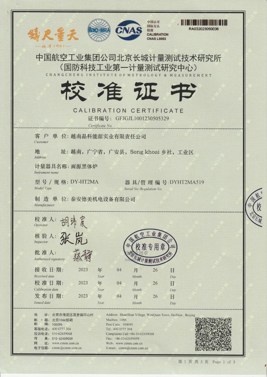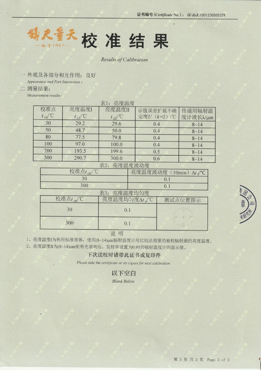 | 上一條:淮安捷泰新能源科技有限公司 黑體輻射源 校準(zhǔn)證書 | 下一條:中溫面源黑體爐-校準(zhǔn)證書 |