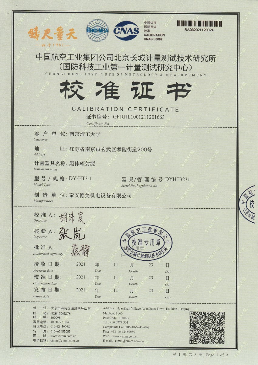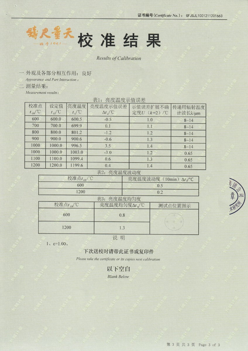南京理工大學-黑體輻射源校準證書600-1200℃ 2021-12-4 本文被閱讀 14207 次