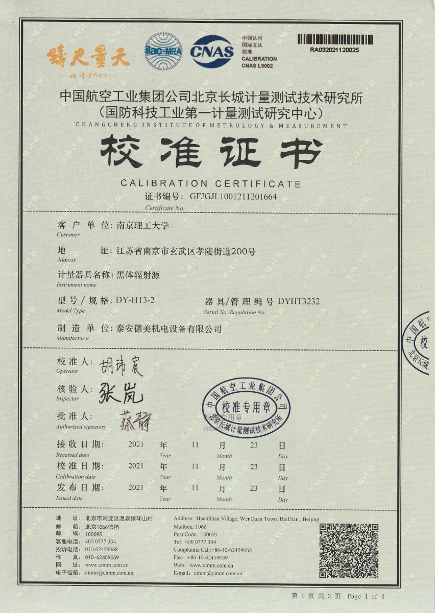 | 上一條:南京理工大學(xué)-黑體輻射源校準(zhǔn)證書600℃ | 下一條:中溫面源黑體爐-校準(zhǔn)證書 |